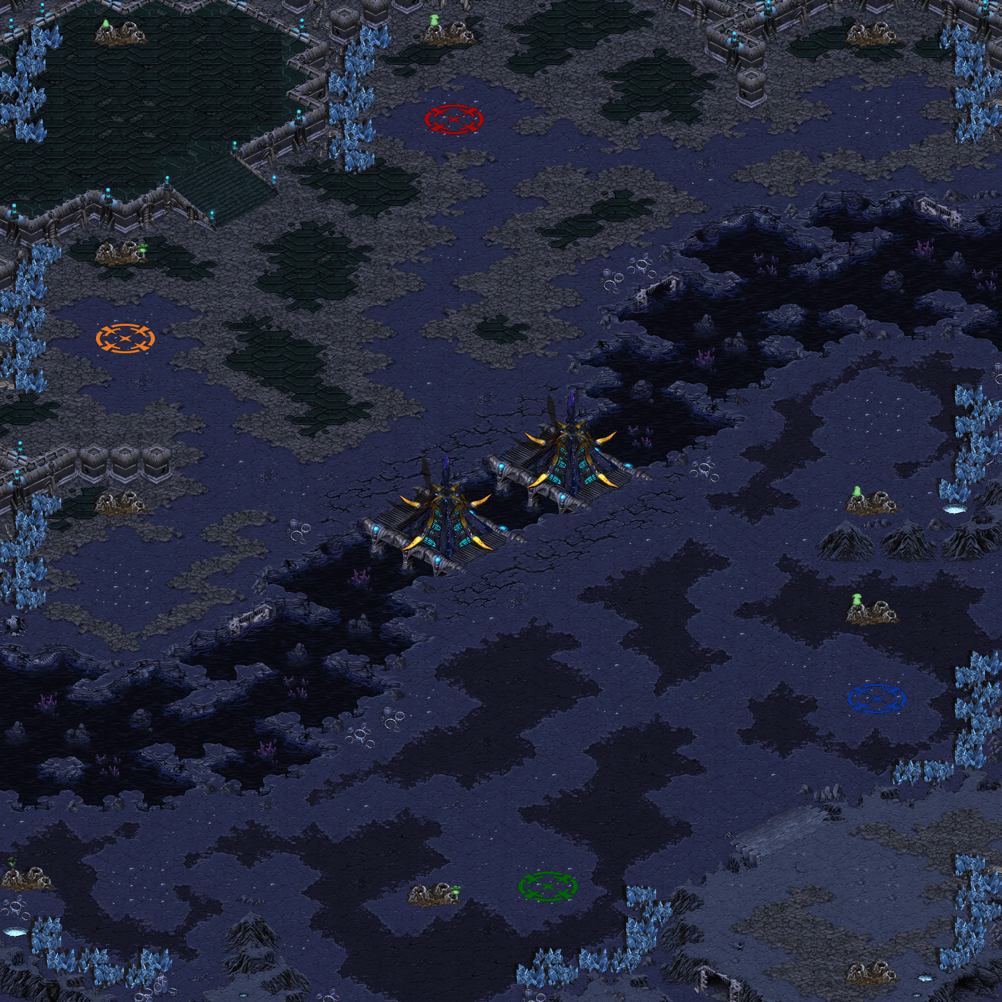 Four players are squeezed onto a tiny-sized 64x64 map! The teams consist of the two southeast players versus the two northwest players. Each team features a large base shared by its two players. Each shared base contains three expansions; one team member gets two expansions while the other only gets one, and some expansions are more exposed than others! Twin central bridges link your team's base to the opposing team's base, though neutral structures must be destroyed to cross the bridges. Control of these bridges is key!