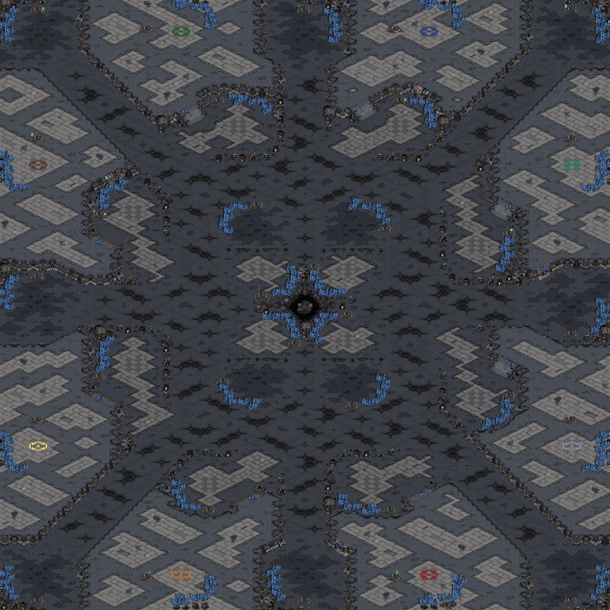 Eight players compete on a medium-sized 128x128 map. The teams consist of the four northeast players versus the four southwest players. Each player has their own base on high ground and access to a natural expansion on the low ground in front of their base. Additional expansions ring the map between the players' bases; though these expansions may appear sheltered, expansions that lie between enemy players are difficult to hold. A final set of expansions are scattered throughout the central junkyard, though these expansions are the most exposed. Be prepared to fight over control of the central junkyard!